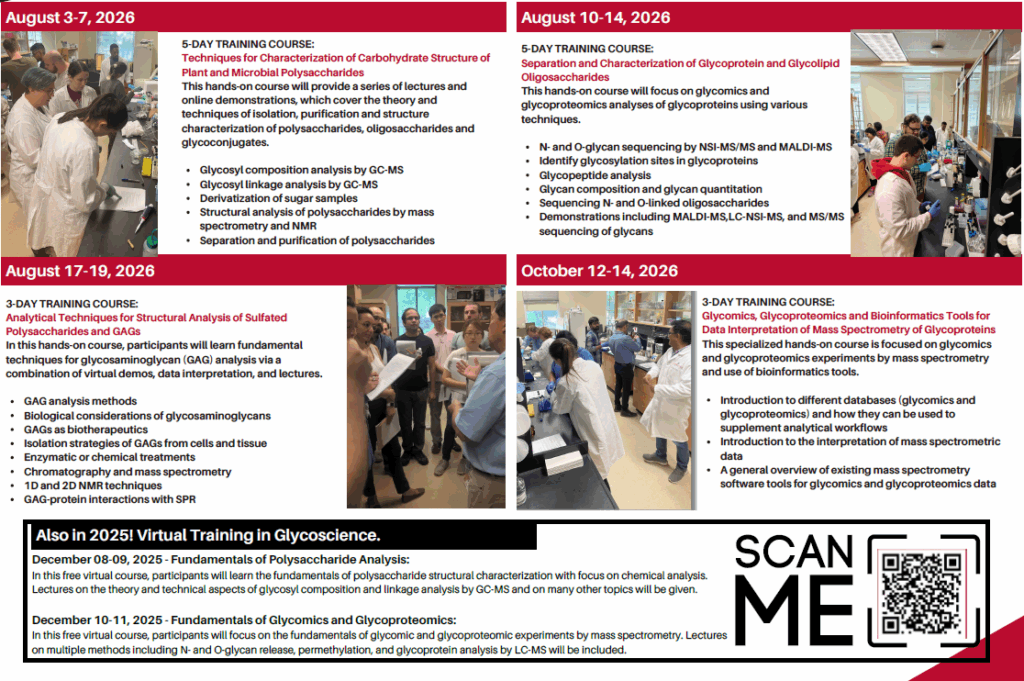 The National Glycoscience Resource at the CCRC offers hands-on and virtual glycobiology training for students, postdocs, and visiting scientists from academic, industry, and government labs worldwide. Each summer, short-term trainees can enroll in one or more of four in-person courses and two virtual courses covering methods and techniques for studying complex carbohydrates.